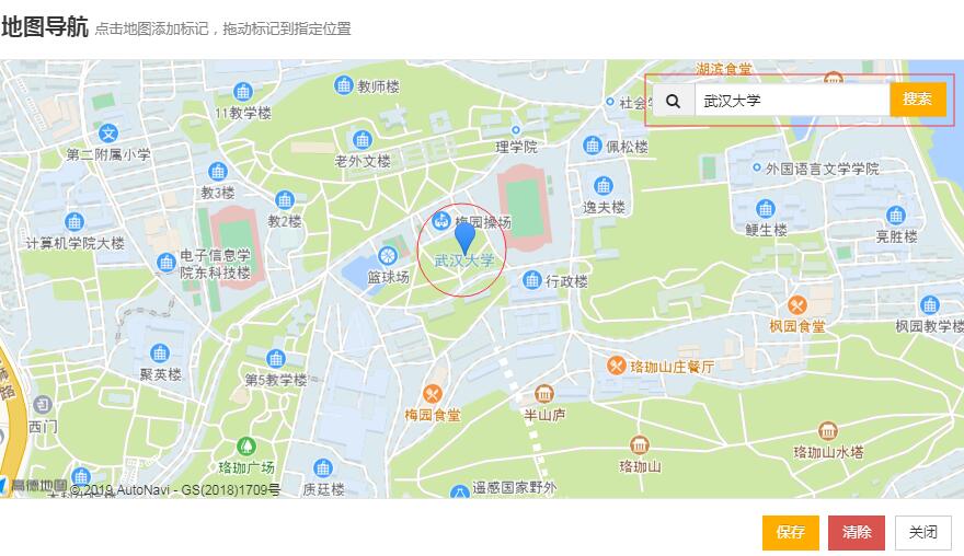 然后點(diǎn)擊“添加地圖導(dǎo)航”功能,網(wǎng)頁彈出地圖,在搜索框中輸入想要標(biāo)注的地址,然后在地圖上面點(diǎn)擊出現(xiàn)如下圖所示藍(lán)色圖標(biāo),然后保存即可。